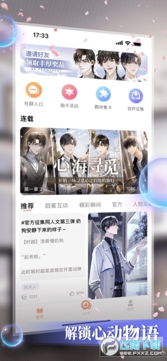 主页专设同人社区,不仅能欣赏他人作品,也可以激扬文字,写出你眼中的他,并向官方投稿,在这里散发热爱。