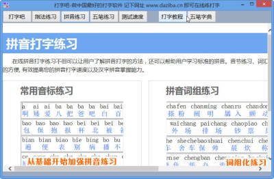 拼音打字练习不但可以让用户了解拼音打字的方法,还可以帮助用户学习标准的拼音。音节练习、词汇练习、文章练习可以给初学汉语或者汉语拼音水平不高的用户提供了极大的方便, 有效提高您的拼音打字速度以及汉字拼音掌握能力。