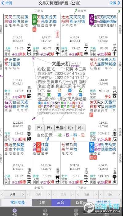 3.提供精心设计的排盘介面,风格简约而不简单,相容命理师和紫微斗数爱好者的既有使用习惯,盘面布局和配色风格与使用广泛的飞星、三合、四化排盘软体保持一致,大幅降低使用门槛。