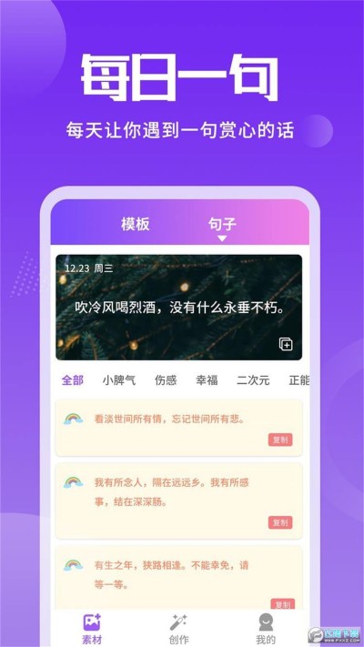 3、照片加文字中有超丰富的文字库,包含了多种系列文案,伤感系列、幸福系列、正能量系列、情侣系列,英文系列等精美文案,一键复制。在自己的照片加上一种心情,就是这么有内涵!