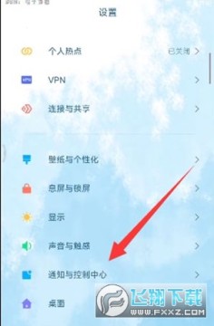 2、在【设置】栏目中找到【通知与控制中心】。