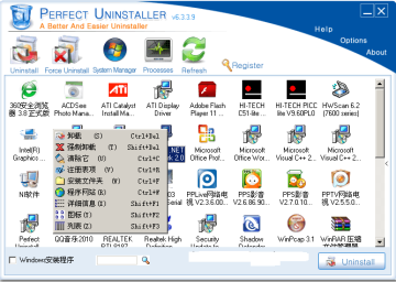 有了完美卸载,您可以方便快捷的卸载个人电脑上不需要的应用程序。标准的添加/删除程序不能总是完全卸载所有的应用程序的碎片和注册表项,而与此相比,完美卸载可以删除遗留的不需要的来及文件及注册表项,这将提高计算机的性能和速度!