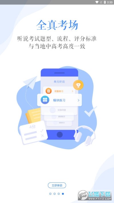 5、全真考场模拟训练:点击”备考“,选中任意一个子栏目,进入对应的模拟考试。模拟考试参照正式的考试流程设计,高度模仿正式听力口语考试,严格按照考试流程进行听力口语考试。