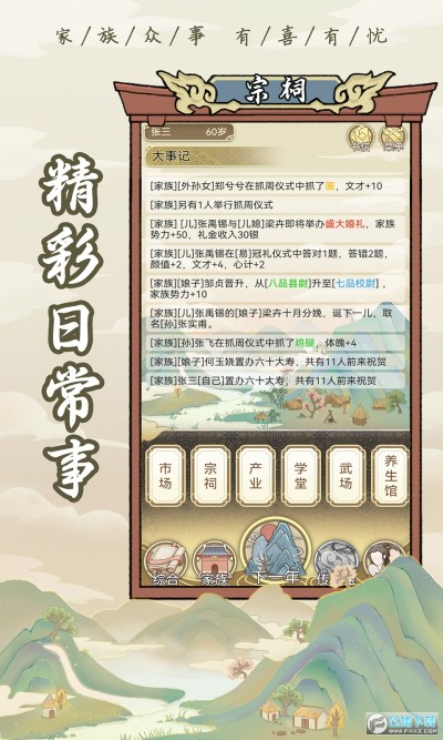 开局即可创建家族,成为家族首代老祖宗,自此之后你可以按照自己的思路来经营自己的家族产业和养育自己的后代。