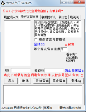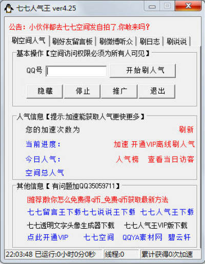 打开自己的QQ空间看到好友爆棚的人气是不是有点羡慕呢?一直以来想拥有人气都离不开七七人气王官方版的支持,那么最新版的七七人气王下载了么?如果还没有的话,那你可得抓紧了,这一天你得和小伙伴差多少的人气呢?七七人气王官方版可谓是众多粉丝的最佳首选,想人气爆棚必须依靠qq空间刷人气软件的支持才可以,刷留言,刷人气还刷微博听众,这一切都没谁了!
