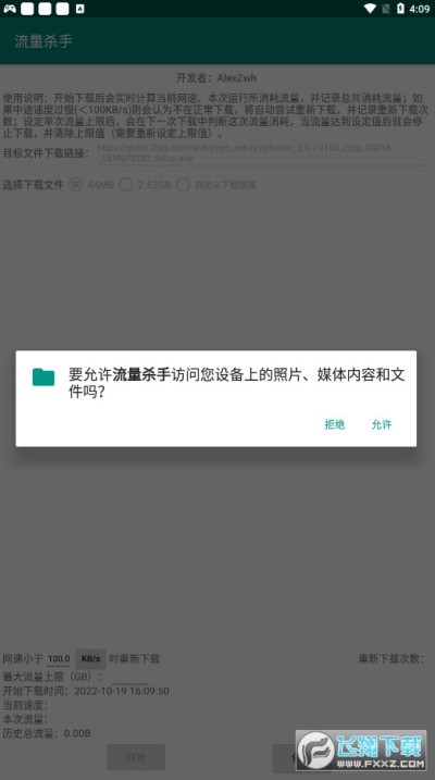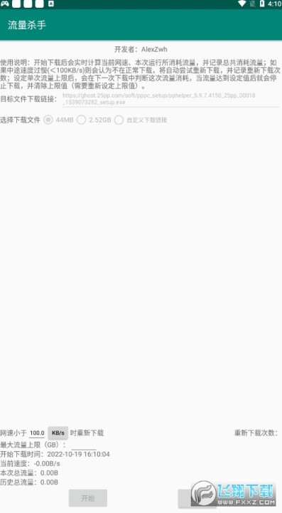 开始下载后会实时计算当前网速、本次运行所消耗流量,并记录总共消耗流量;如果中途速度过慢(<100KB/s)则会认为不在正常下载,将自动尝试重新下载,并记录重新下载次数;设定单次流量上限后,会在下一次下载中判断这次流量消耗,当流量达到设定值后就会停止下载,并清除上限值(需要重新设定上限值)。