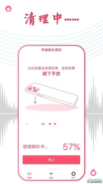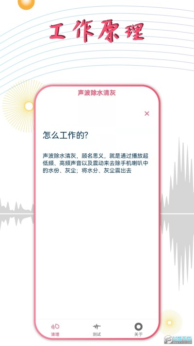 声波除水清灰是一款帮助手机清理灰尘的APP。软件通过播放超低频、高频声音以及震动来去除手机喇叭中的水份、灰尘,声波除水功能只是作为一个辅助手段,并不能确保一定成功,请用户悉知。