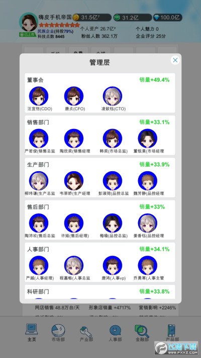 国产手机帝国手游官方版最新版是一款手机为题材的模拟经营养成类手游,游戏里玩家需要打造自己的国产收集公司,招募各种不同职位的员工,研发和收集相关的科技来提升更强大的技术,根据行业和世界里的事件作出选择,研究出更强大的手机来改变整个世界吧!
