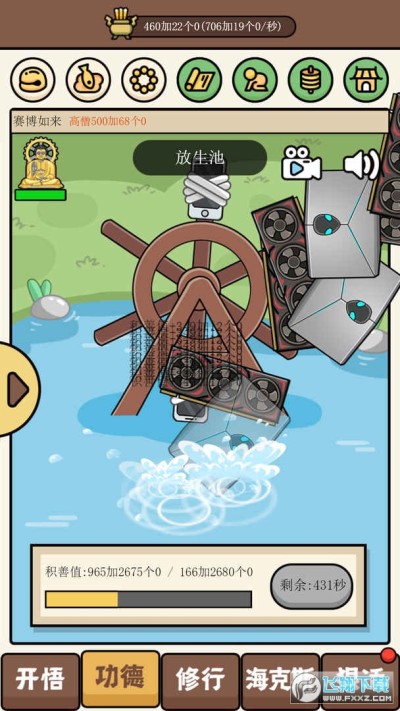 2、在这里,你可以用筋膜枪敲木鱼积攒功德,用循环放生机积德行善,电子佛祖陪你笑。