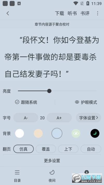 3、字体和行距可以随意调整,支持多种翻页模式,日夜一键切换,自定义亮度调节,给你更舒适的阅读体验;