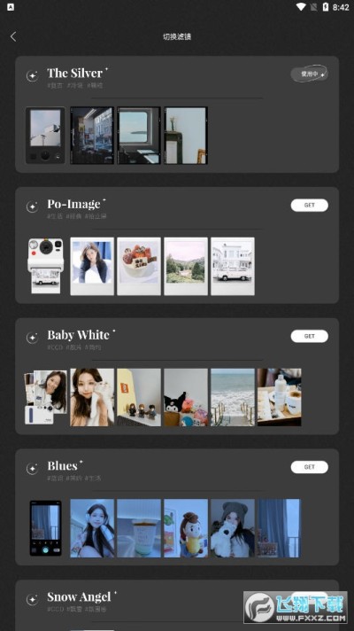 2、精选多款经典胶片滤镜,每个主题都根据风格搭配好不同的胶片颗粒、时间水印、漏光特效与胶片相纸等等的成像效果,让你每次拍照都充满惊喜;