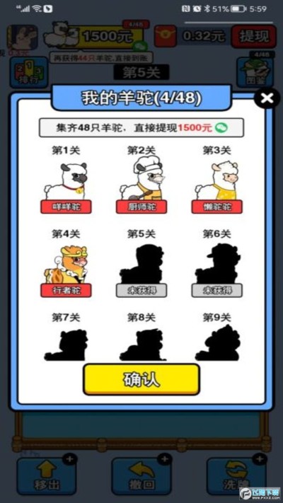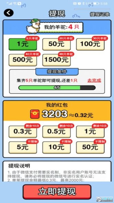 2、最低提现门槛是50元,想要提现50元首先需要凑齐20只羊驼,羊驼是每次通关送一只,意味着你需要通关20次。