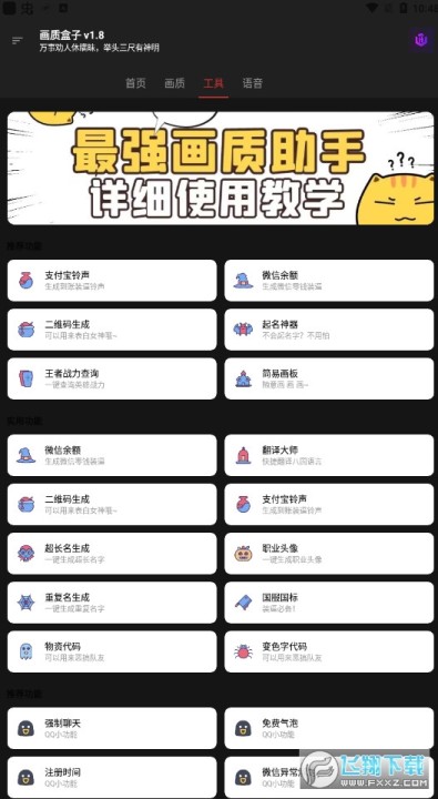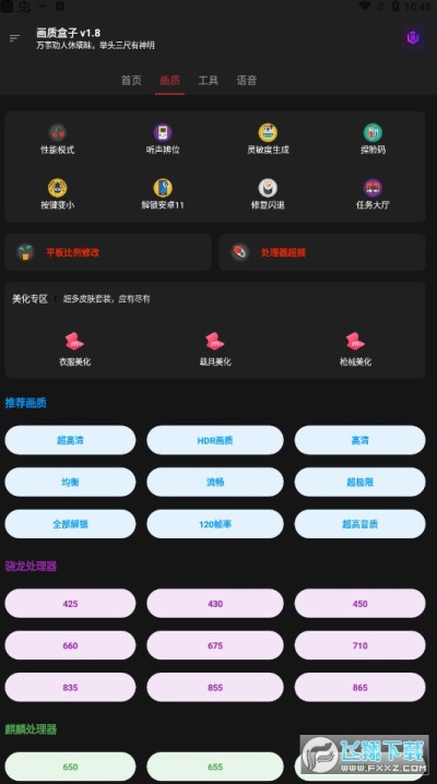 《画质盒子下载最新版本》是一款提供画质修改、手机工具、语音包等丰富内容的手机软件,这款画质盒子的软件可以辅助玩家进行游戏,享受超爽、超高清的画面品质,有需要的快来下载吧!