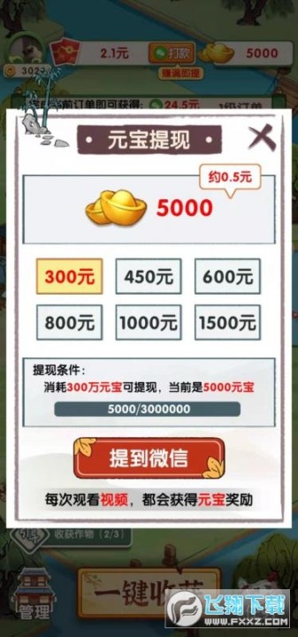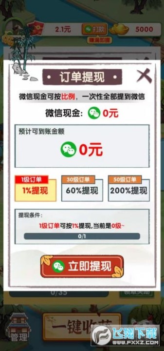 这个游戏主要是靠完成订单拿红包,奖励高的领取漂浮红包会更好一点,我手机黑没办法。百分之一提现方式,完成30级订单之后可按60%比例兑换,50级订单之后甚至可按200%比例兑换。当然,这个比例仅看看就好了,等后面奖励小了,比例高也没什么用。