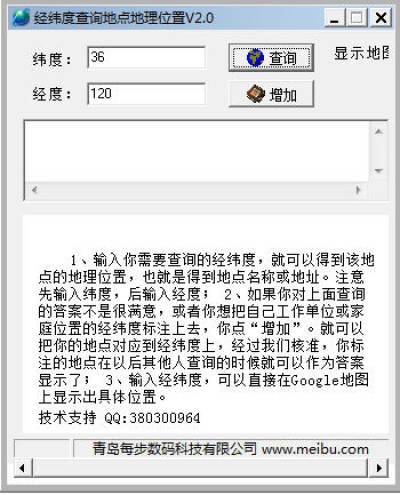 经纬度查询地点地理位置软件是一款由青岛美步数码科技有限公司推出的与各大知名地图搜索工具共享资源的免费地理经纬度查询工具。