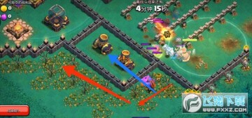 7、女王拆掉x弩后,在如图所示位置放超级蓝胖,超级蓝胖会先按蓝色箭头方向摧毁两个迫击炮,然后往红色箭头方向移动。