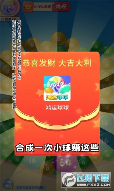鸿运球球红包版是一款休闲消除赚钱游戏。游戏玩法非常简单,玩家只需要点击相同数字的小球合成更大的数字,不断的完成游戏任务即可获得丰厚的红包奖励,更多精彩内容等你来体验,感兴趣的小伙伴们快来下载游戏试试吧!