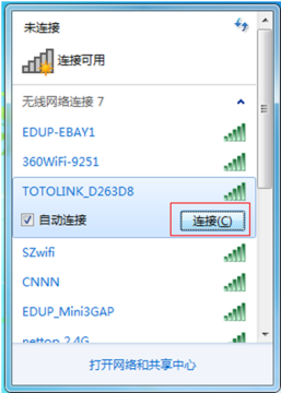 点击无线网络连接图标,打开无线网络列表,选择需要连接的无线信号,双击该无线信号(或点击“连接”按钮)。