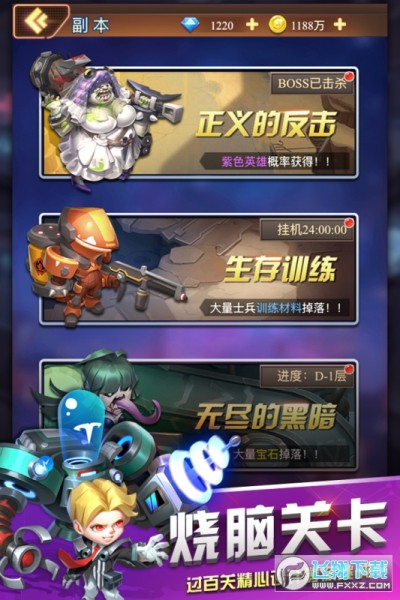 以为是一个保卫萝卜玩法的游戏,谁知道是个卡牌+英雄+塔防的游戏,多种元素化的玩法,还是值得眼前一亮的,最主要游戏不怎么氪金,有保肝抽卡,最主要是有得挂机,把英雄等级升上了就可以刷刷刷过了~