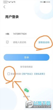 2、下载完成后点击进入,输入手机号,获取验证码,并勾选下面的同意用户协议。