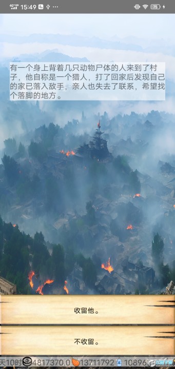 四十九天官方版手机版是一款文字题材的角色扮演手游,玩家在游戏里将要扮演村长,在游戏里了为了保护更多的村民展开故事,收集各种资源和物资来应对各种突发的情况,根据不同的故事发展来做出自己的选择,喜欢的小伙伴快来下载试试吧!