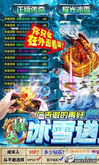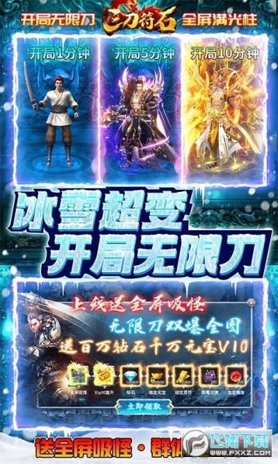 1、【复古冰雪】充值比例1:10000!上线送VIP10直升卡,送百万钻石、千万元宝!送变态技能全屏吸怪!