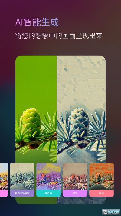 2、输入关键词, app中的AI技术可以让你发挥出最大的创造力,让原本无聊的关键词,在短时间内化作一幅充满创意的作品。