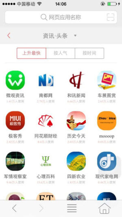 弱水三千只取一瓢,微用空间不可斗量。在微用简洁的页面设计之后,囊括了3000多个优质应用,而所有应用的大小只有2M。微用时代,传统内存限制将被打破。拥有微用“神奇口袋”,三千应用任君取用,用户无需因为内存限制而在喜爱的多种应用之间挣扎选择。以H5技术为基础的微用,拥有强大的自适应能力,能够轻松跨越平台体验鸿沟,让用户获得更加顺畅自由的移动互联网体验。