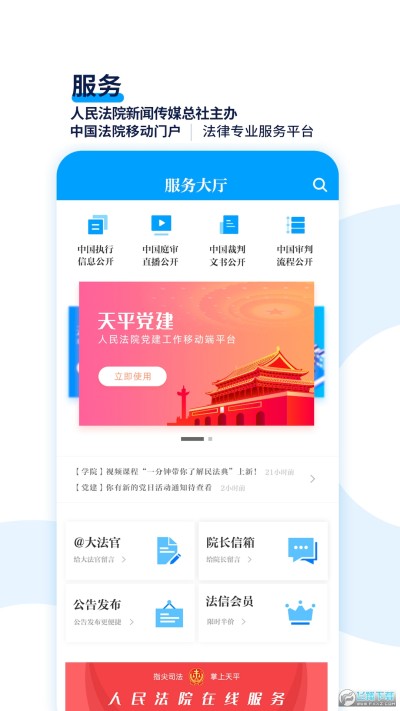 天平阳光app官方下载最新版是一款微法院形式的手机软件,结合了中国法制新闻、法律服务、社交为一体的手机平台软件,有权威的法律咨询,可以在线点击了解和掌握精彩的视频内容,实时互动,了解精彩动态,有需要的赶紧下载体验吧!
