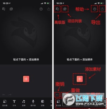 新建项目后,我们就可以在编辑状态的主页面按加号来从手机内添加素材到项目。图里也介绍下主界面的一些基本功能。