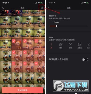 你可以一次性的选择多张照片或者视频一起添加进项目。通过右上角的设置按钮,你可以进行如下的设置