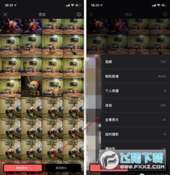 3、点击添加素材的加号后,系统会显示你手机内的相册,你也可以点击左下角的相机胶卷来选择你手机内不同的相册,比如照片,视频,实况照片等。