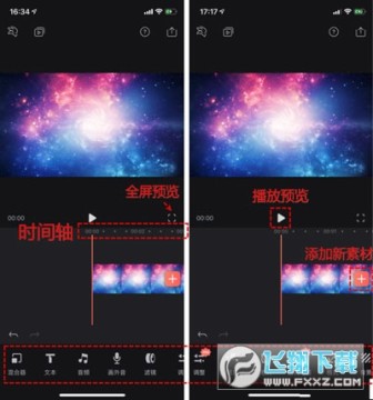 在我们添加完素材后,在主界面会有时间轴展现,这是视频处理中最重要的元素。预览也是很重要的功能,能让我们随时来回查看编辑的效果,来做出调整。