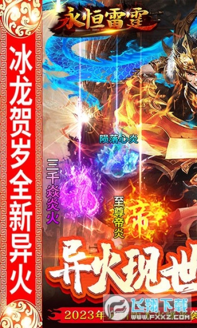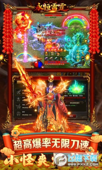 《永恒雷霆》上线送88万钻石,2亿元宝,青莲地心火,异火现世,万火臣服。炫酷冰龙战宠来贺岁,合体超强伤害加成,一刀一个小朋友。主线一点秒升百级,一款独创1秒99刀,无限攻速,百倍爆率,所有装备,所有特殊装备以及材料游戏内全部能爆。主线送复活神器【鸿蒙·重生】,享受死亡原地复活。极品吸血武器,刀刀暴击,刀刀吸血。特色狂暴系统,刀刀切割,满屏爆光柱。装备全靠打,小怪爆终极。