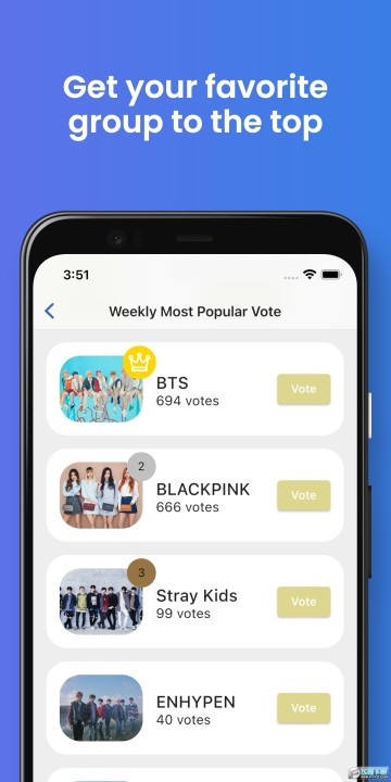 有什么比表达对你最喜欢的韩国流行歌星的爱更好的呢?我们的 Kpop 社区应用程序允许您为 Kpop 投票。通过投票并让他们登上顶峰来表达对你的斯坦的爱。