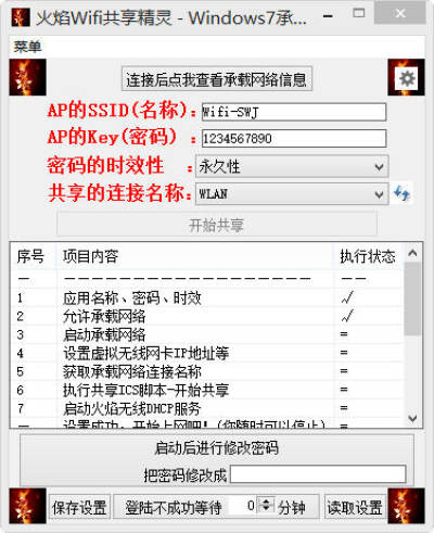 火焰Wifi共享精灵绿色版是一款可以把电脑无线网卡分享出wifi热点的网络共享软件。软件原理为互联网相关控件包ICS共享,需要windows防火墙的支持。它可以帮你的电脑快速建立一个无线WIFI网络。用户可以用此工具将拥有无线网卡的电脑变成WiFi热点,手机、平板等无线设备就可以通过此热点免流量上网了。