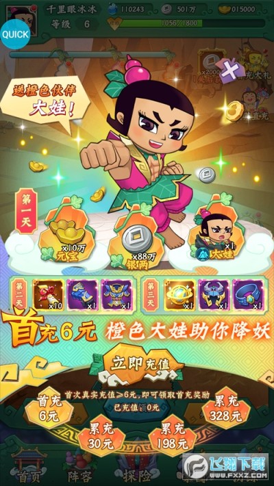 ★首充最高8倍返还,登陆七天送七子合体神将-小金刚和最强伴侣小蝴蝶,还有大量招募券、神充卡、橙将葫芦娃等你来领