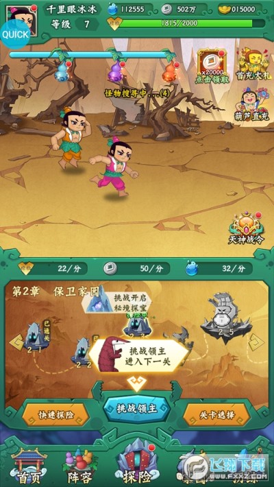 由上海美术电影制片厂正版授权,以86年剪纸风《葫芦兄弟:七子降妖》动画片为原型的手游大制,深度还原动漫情节。游戏内含全新特色玩法-葫芦直充,可通过游戏进度获取钱包余额,可在游戏内实现免费提现,激活累计充值活动的超强体验功能。可轻松练级,休闲挂机,忙时经验不错过,上线挑战奖励多丰富,您可以和葫芦七兄弟共闯妖巢!带领葫芦兄弟披荆斩棘,洞破妖洞大门!保住穿山甲,救出爷爷,就在《葫芦兄弟:七子降妖-免费支付余额》!