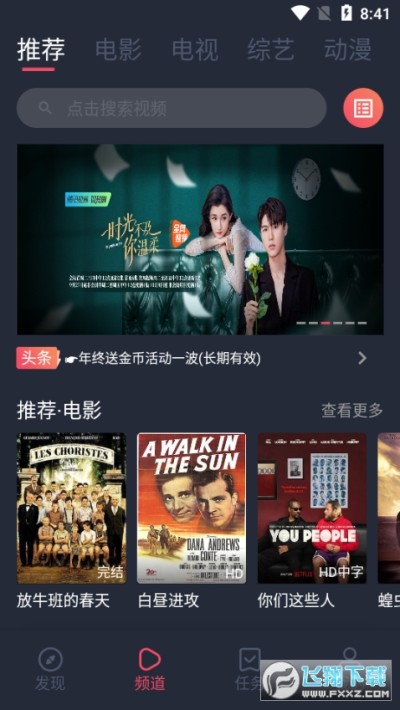 1、软件的界面简洁,操作也简单,打开之后可以进行相关的搜索,在上面可以看到更多类型的电影。