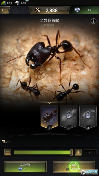 为了争夺资源, 扩张势力, 你必须组建强大的蚁队, 而一支强大的队伍里,除了众多高等级的兵蚁, 还需要变异蚁领队-特化蚁, 通过孵化异化卵可获得强大的特化蚁。在兵蚁和特化蚁的强强联手之下, 你的蚁队必将势如破竹, 粉碎你的敌人!
