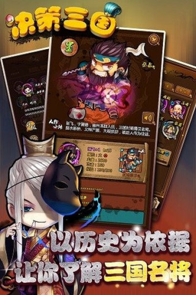 决策三国独是一款卡牌游戏,特创新战棋战斗模式。以三国为背景,以历史为剧情,以武将为角色,玩家通过收集武将,排兵布阵组建属于自己的队伍。和关羽一起温酒斩华雄,和赵云一起单骑救主,和曹操一起决战官渡,和周瑜一起火烧赤壁,称霸三国。