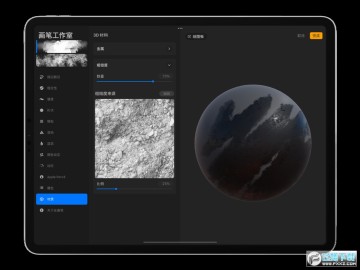 在「画笔工作室」中,新增了一项针对 3D 贴图绘制的画笔参数「材质」。通过设置调整「金属」和「粗糙度」两组参数,可以赋予画笔在绘制 3D 贴图时的金属感或天鹅绒质感的反光效果。
