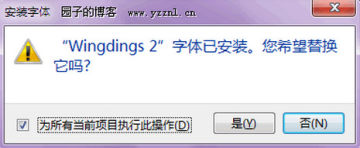 在操作中会发现 Windows 7 在安装字体时比 XP 系统方便了很多,比如在安装字体时遇到已经安装或者字体损坏的情况时,会弹出如下图窗口提示: