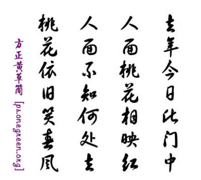 方正黄草简体字体又称:方正黄草字体,是一款设计精美的书法字体,可用于签名设计、美工处理等草书是汉字的一种字体。它出现较早,从汉代初期,书写隶书时有时才“草率”地书写而形成的,由于汉章帝喜好草书,因此被称为“章草”,是一种隶书草书。章草字字独立,接近于行草,但对难写之字简化不多,书写不变。后来楷书出现,又演变成“今草”,即楷书草书,写字迅速,往往上下字连写,末笔与起笔相呼应,每个字一般也有简化的规律,但不太熟悉的人有时不易辨认。一般也把王羲之、王献之等人的草书称为今草。