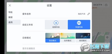 6、在通用设置中,可以设置你的爱车名字、自定义车标以及日夜模式的设置,还能开启显示交通状况、显示比例尺缩放、同步手机端搜索记录等功能