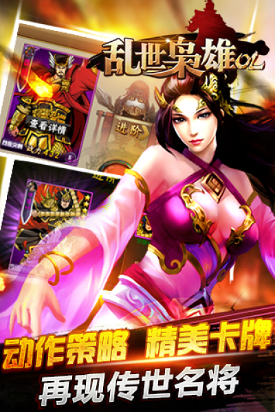数百员猛将、几十类特色兵种、上百种特色技能结合强大的装备系统,超经典霸气传世名将,超酷炫狂拽三国神兵,超激烈震撼史诗国战,超完美动作策略卡牌,将古代战争策略表现得淋漓尽致!