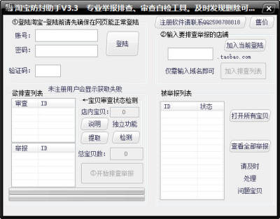 本软件开发之初是因为一位朋友卖电子资料,经常被同行举报,跟我一合计,将他之前手工排查的方法做成了一套自动排查软件。这款软件不仅仅可以排查到别人举报你,而且可以排查到淘宝小二正在关注你的某款宝贝。如有风险,可及时下架处理,风头一过再上架。百试百爽。现在我把这款软件推荐给各位做一些擦边商品的淘宝卖家,希望可以对亲有所帮助。