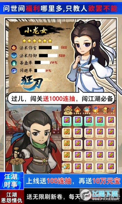 小虾米闯江湖钱包提充变态服是一款大型的安卓端放置武侠题材手游,游戏以经典的原著改编打造,Q版的人物角色形象,上线送VIP10,免费即可领100连抽,还赠10万元宝,对游戏感兴趣的话不妨点击下载试试!