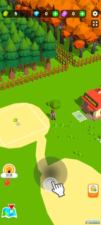1、进入小小木材商游戏之后,控制虚拟键盘移动人物,点击方框中的钞票解锁一个仓库;