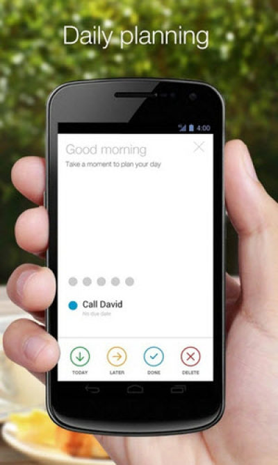 和所有的任务管理应用一样,Any.DO也支持任务添加、标记完成、优先级设定等基本服务。除此以外,Any.DO还提供通过语音输入创建任务,通过手势进行任务管理等服务,如通过拖放分配任务的优先级,通过滑动标记任务完成,通过抖动手机从屏幕上清除已完成任务等。